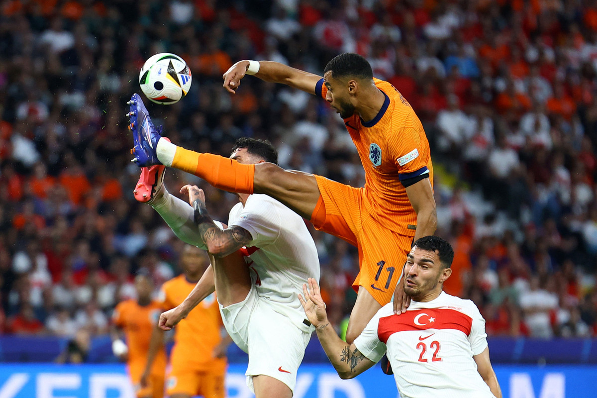 Hậu vệ Hà Lan lăn xả cứu nguy. Okay Yokuslu (5) và Kerem Akturkoglu (7) lần lượt bỏ lỡ cơ hội với những cú dứt điểm ở góc thuận lợi trong vòng cấm.