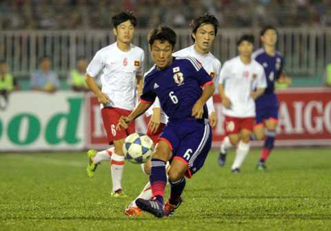 Phút 38: Yusuke đối mặt với Văn Trường trong vòng cấm. May cho U19 Việt Nam là cái chân của Trường đã cứu cho chúng ta 1 bàn thua.