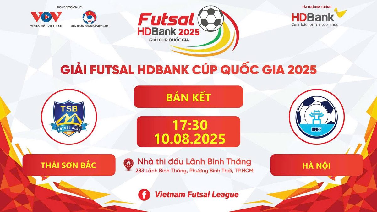 10/08/2025 16:41:00 +07:00(VTC News) - Trực tiếp bóng đá Futsal HDBank Cúp Quốc gia 2025: Đầy đủ diễn biến trận đấu Thái Sơn Bắc vs Hà Nội diễn ra lúc 17h30 ngày 10/8.
