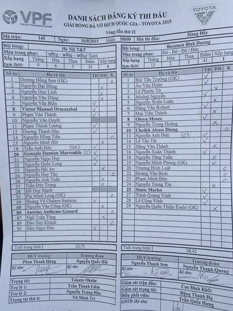 Văn Quyết và Duy Mạnh không có tên trong trận đại chiến tại sân Hàng Đẫy. Trong khi đó, về phía đội khách, Công Vinh ra sân ngay từ đầu sát cánh cùng Anh Đức trên hàng công của B.Bình Dương.