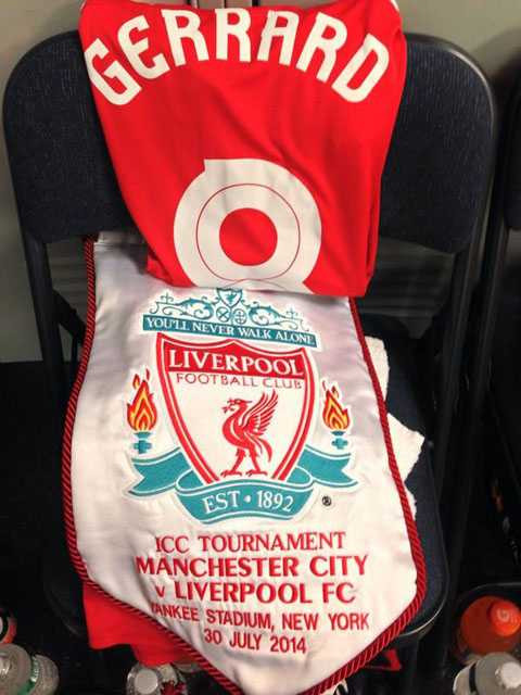 05h28: Cả hai đội sẽ được mặc trang phục truyền thống ở trận này. Dưới đây là hình ảnh áo và cờ lưu niệm của thủ quân Steven Gerrard.