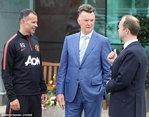 21h45: Louis van Gaal đang trò chuyện cùng Ed Woodward và Ryan Giggs về tương lai của Man Utd tại sân tập AON.