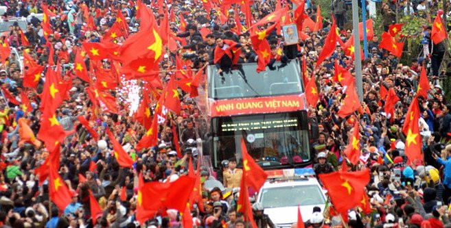 | 13h50 Đoàn xe chở các cầu thủ U23 đã rời sân bay Nội Bài để trở về trung tâm thành phố. Hiện tại, đoàn xe đã đi qua khu vực cầu Nhật Tân. Người dân hai bên đường đang ùa ra để cổ vũ cho các cầu thủ U23 Việt Nam. ![]() Rừng cờ của người hâm mộ vây kín xe bus chở các cầu thủ. (Ảnh: Phạm Thành) ![]() Huấn luyện viên và các cầu thủ trong vòng tay của người hâm mộ. | |