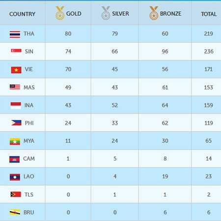 Kết thúc ngày thi đấu 14/6, đoàn Thể thao Việt Nam đoạt 73 HCV, 51 HCB, 56 HCĐ, xếp thứ ba trên bảng tổng sắp huy chương sau Thái Lan (87 HCV) và nước chủ nhà Singapore (81 HCV).