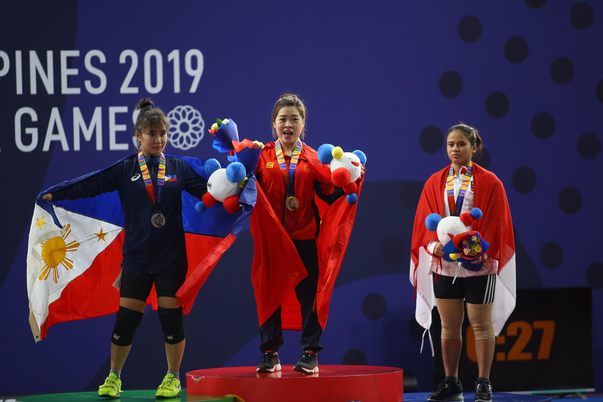 | 10h Hoàng Thị Duyên giành HCV cử tạ nội dung 59kg nữ. Tổng cử của Hoàng Thị Duyên là 210 kg (cử giật 95 kg và cử đẩy 115 kg), hơn người về nhì 21 kg. Đây là tấm HCV thứ 17 của đoàn Việt Nam. ![]() Hoàng Thị Duyên chiến thắng dễ dàng ở nội dung 59kg. (Ảnh: Hà Thành) ![]() Hoàng Thị Duyên hạnh phúc sau khi chinh phục thành công mức tạ 115kg. (Ảnh: Hà Thành) |