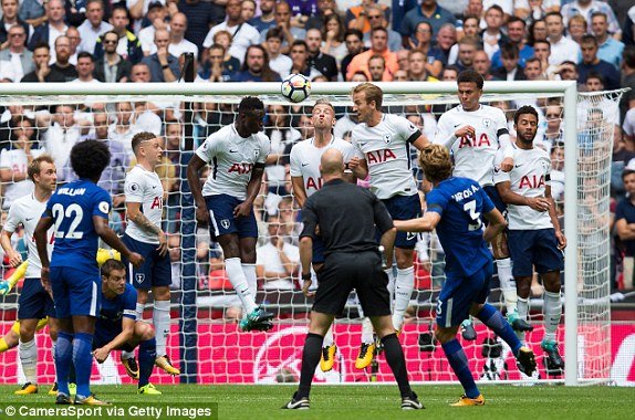 | 23' Đá phạt cho Chelsea ở vị trí nguy hiểm. David Luiz đã bị Dele Alli phạm lỗi ngay sát vòng cấm địa. |