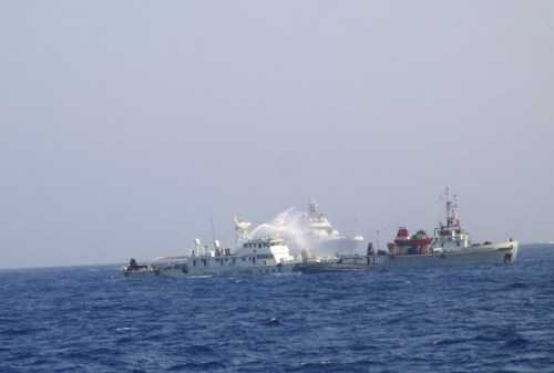 | Tàu Trung Quốc hung hăng ngăn cản tàu chấp pháp của Việt Nam. |