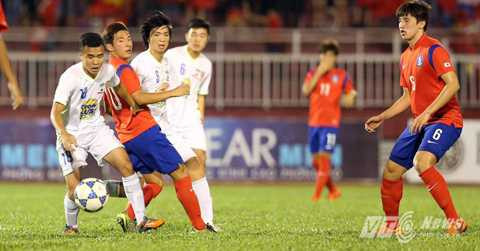 | Văn Toàn không vượt qua được 2 cầu thủ U19 Hàn Quốc (Ảnh: Quang Minh) |