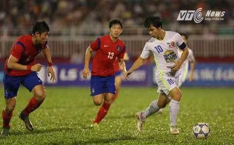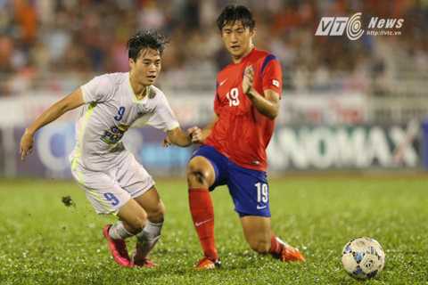4' U19 Hàn Quốc là đội có tình huống nguy hiểm đầu tiên. Bóng rơi gần như ngay trên vạch cầu môn. Hàng thủ U21 HAGL bị giật mình và có phần chủ quan.