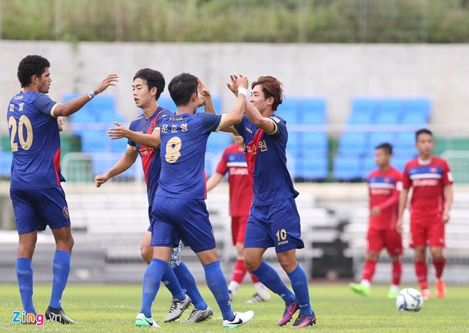 10': VÀO... VÀO... VÀO... Tỷ số được mở cho Busan FC. Xuất phát từ sai lầm của hàng thủ U22 Việt Nam, tiền đạo Lee Gun Woo đã mở tỷ số cho đội bạn.