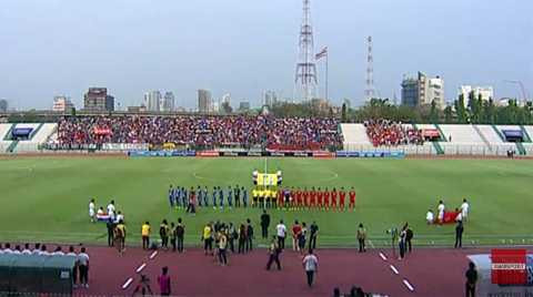17h55': Hai đội bước ra sân và làm nghi thức chào cờ.