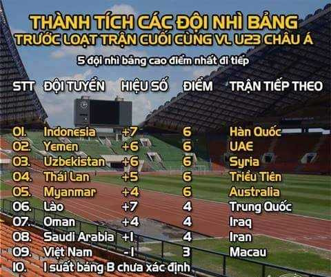 Hiện U23 Việt Nam đã vươn lên đứng thứ 5 trong top10 đội nhì bảng. Để an toàn, U23 Việt Nam cần ghi thêm 4 bàn thắng nữa vào lưới U23 Macau.