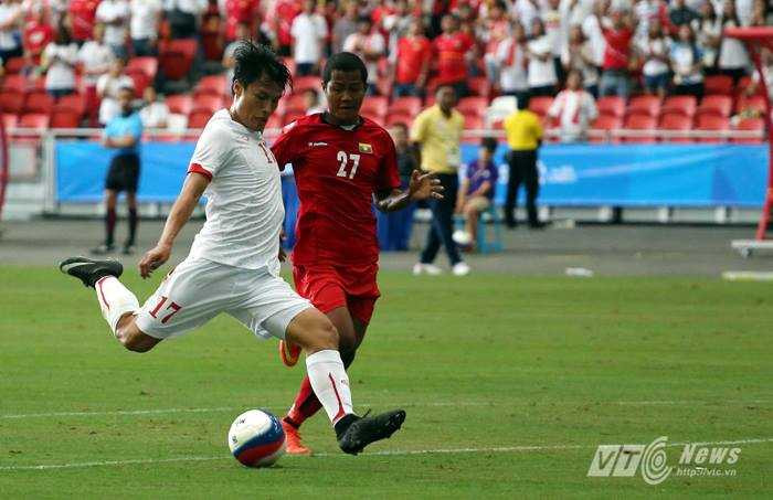 6' Công Phượng bấm bóng vào vòng cấm cho Huy Toàn, nhưng thủ môn U23 Myanmar đã băng ra làm hẹp góc sút của cầu thủ SHB Đà Nẵng.