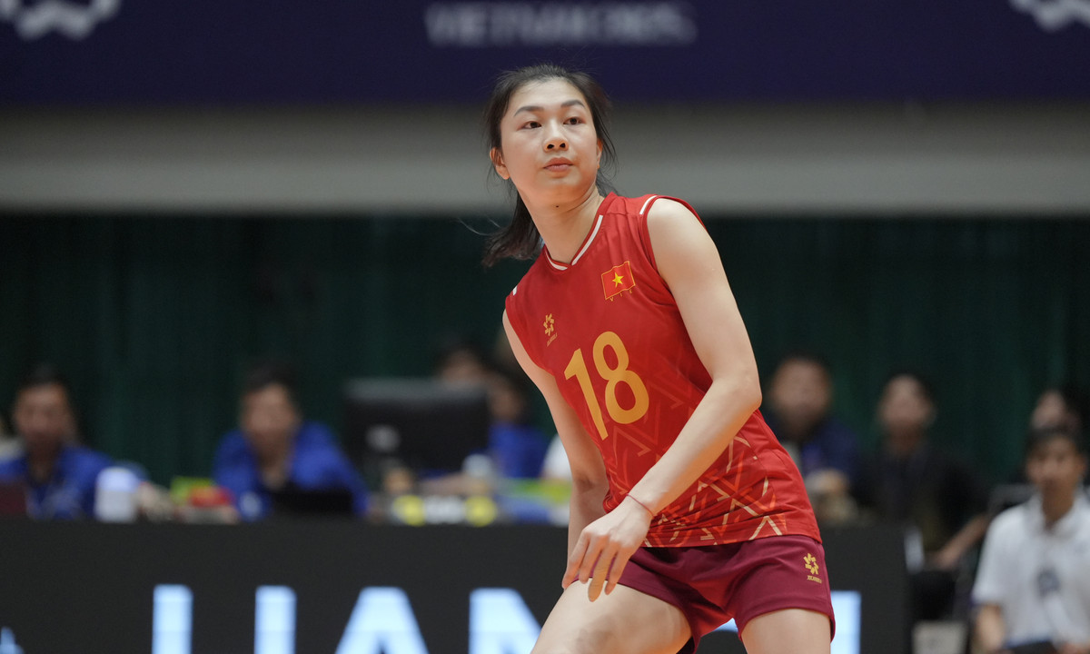 Đội tuyển Việt Nam (áo xanh) thi đấu với đội hình gồm Như Quỳnh, Kiều Trinh, Nguyễn Trinh, Khánh Đang, Nguyễn Phương, Kim Thoa.