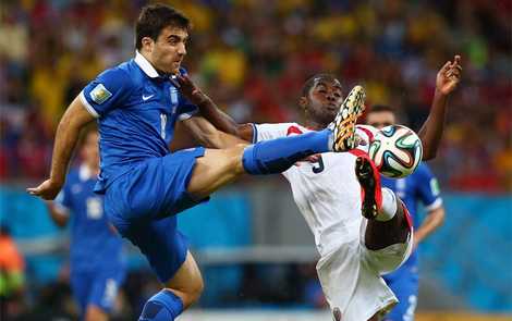 74': Gekas của Hy Lạp không thể dứt điểm sau đường căng ngang của đồng đội khi mà anh bị kẹp giữa hai cầu thủ Costa Rica trong vòng cấm.