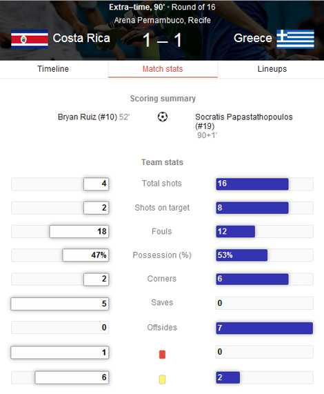 Những tưởng trận đấu sẽ khép lại với phần thắng nghiêng về Costa Rica thì vào phút bù giờ, Sokratis đã mang về bàn thắng gỡ hòa cho Hy Lạp. Kết quả này buộc hai đội phải bước vào 2 hiệp phụ và sau đó là những loạt sút 11m đầy may rủi.