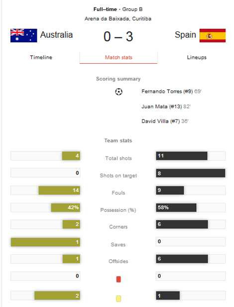 Nhiều cổ động viên Tây Ban Nha ao ước giá như trận gặp Australia là trận ra quân của đội nhà thì có lẽ cục diện cả World Cup đã khác. Trong 90 phút, Tây Ban Nha phô bày toàn bộ những nét đẹp đáng quý nhất của tiki-taka và mang theo bao tiếc nuối của người Tây Ban Nha. Thắng Australia 3-0, Tây Ban Nha ngẩng cao đầu chia tay World Cup.