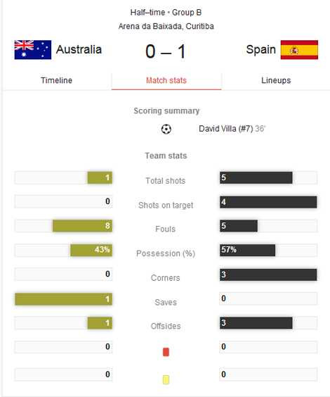 17': DỨT ĐIỂM... Tình huống sút bóng đầu tiên của Tây Ban Nha. Người kết thúc là Cazorla sau một tình huống bật nhả trong phạm vi hẹp với David Villa. Tuy nhiên, bóng không vượt qua được sự lăn xả của trung vệ Australia.