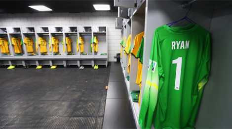 | Phòng thay đồ của ĐT Australia. Đội bóng xứ chuột túi sẽ ra sân với trang phục truyền thống áo vàng. |