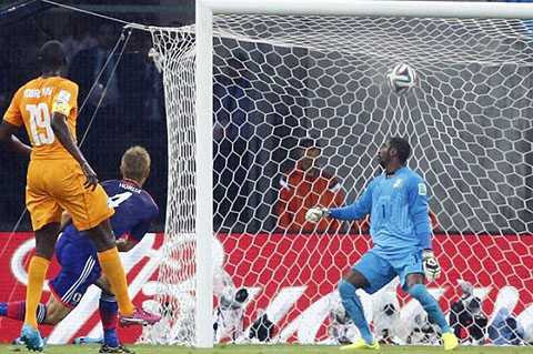 80' Drogba sút phạt kỹ thuật. Bóng vòng qua hàng rào rất đẹp, nhưng thủ môn Nhật Bản vẫn kịp thời bay người đẩy bóng.