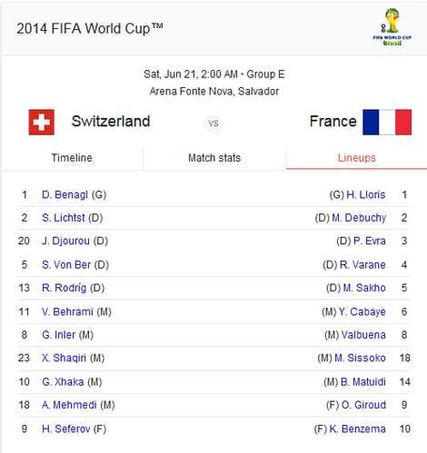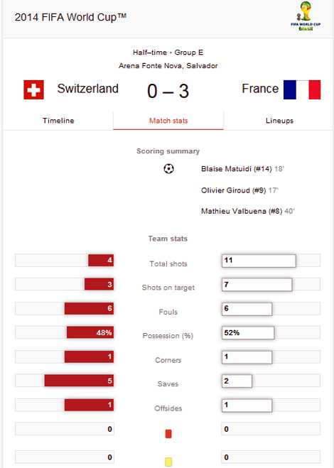 29': KHÔNG VÀO... Một pha tổ chức tấn công có nét của Thụy Sỹ được kết thúc bằng một pha sút xa buộc thủ thành Benaglio phải đấm bóng. Shaqiri sau đó băng vào sút tiếp, đưa bóng đi chệch cột dọc khung thành ĐT Pháp trong gang tấc.