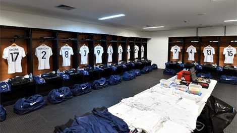 | Phòng thay đồ của ĐT Pháp. Đội bóng của đất nước hình lục lăng sẽ ra sân với trang phục màu trắng. |