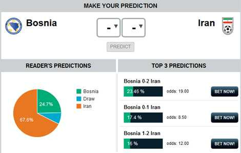 90' Trận đấu có 3 phút bù giờ.83' Đúng 1 phút sau bàn rút ngắn tỷ số của Iran, Vrsajevic tung ra cú sút bằng chân phải thiết lập khoảng cách 2 bàn. Tỷ số là 3-1 cho Bosnia.
