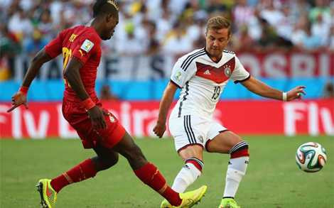29': Hàng thủ Ghana đang chơi lăn xả và ngăn chặn khá hiệu quả những đợt tấn công của Đức.