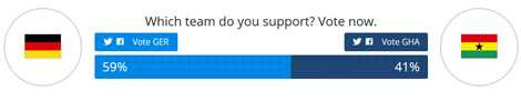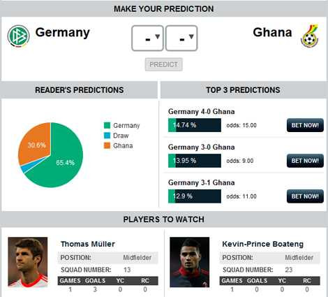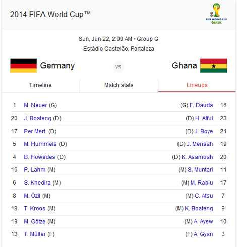 35': Những quả chọc khe đang là vũ khí lợi hại của Đức. Các cầu thủ thoát xuống và ở tư thế thuận lợi nhưng lại còn thiếu chính xác ở những tình huống cuối cùng. Trong khi đó, Ghana chơi phòng ngự số đông, bọc lót khá tốt. Họ cũng biết tấn công đầy chớp nhoáng và thực sự đã tạo ra những sóng gió trước khung thành Đức.