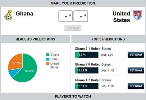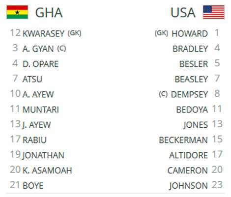 82': VÀO... VÀO... VÀO... Ghana có bàn thắng quân bình tỷ số. Xuất phát từ biên trái, bóng được chọc khe vào vòng cấm cho Gyan nhả bóng ngược trở lại để Andre Ayew đi bóng thêm 1 nhịp rồi vẩy má ngoài rất điệu nghệ, tung lưới Howard.