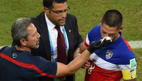 34': Dempsey của Mỹ đã đổ máu sau một tình huống va chạm với Boye của Ghana. Đầu gối chân của cầu thủ mang áo 21 bên phía Ghana đã thúc mạnh vào mũi đội trưởng của Mỹ.