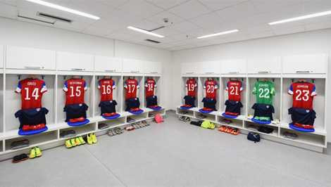 | Phòng thay đồ của ĐT Mỹ. Đội bóng xứ cờ hoa sẽ ra sân với trang phục màu đỏ |