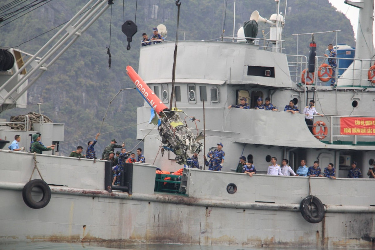 Theo ghi nhận của PV VTC News tại hiện trường, đến 11h30 ngày 6/4, lực lượng chức năng đã trục vớt được thân và đuôi máy bay trực thăng Bell-505 rơi xuống vịnh Trà Báu, thuộc quần đảo Cát Bà, Hải Phòng. Lúc 11h44, tàu Hải quân 885 rời khỏi hiện trường mang theo phần thân, đuôi máy bay gặp nạn vừa trục vớt.