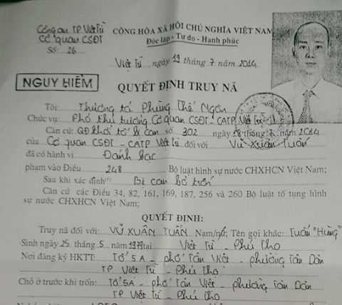 | Quyết định truy nã đối với Vũ Xuân Tuấn. |