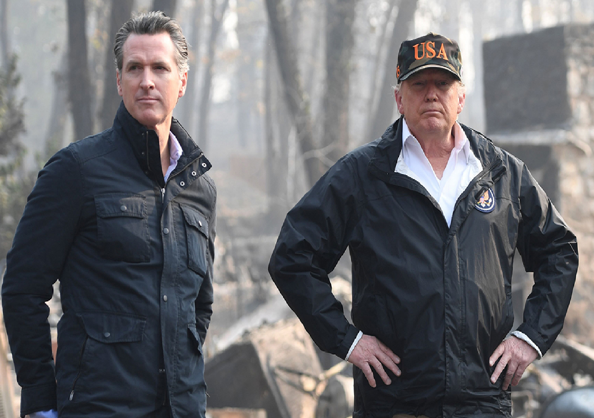 Tổng thống Donald Trump (phải) cùng Thống đốc California Gavin Newsom thăm Paradise, bang California trong thảm họa cháy rừng hồi tháng 11/2018. (Ảnh: AFP)