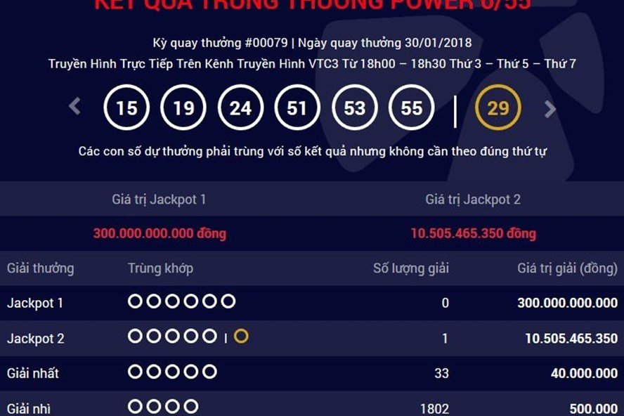 Cùng đó, trong kỳ qua tối 30/1, giải Jackpot 1 loại hình xổ số Power 6/55 chính thức cán mốc 300 tỷ đồng, mức cao nhất từ trước đến nay với loại hình xổ số Vietlott. Mặc dù giải Jackpot 1 không nổ, nhưng một người chơi may mắn đã trúng Jackpot 2 trị giá trên 10 tỷ đồng.