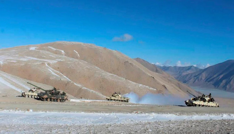 Quân đội và xe tăng của Ấn Độ và Trung Quốc rút khỏi bờ khu vực hồ Pangong Tso. (Ảnh PTI)