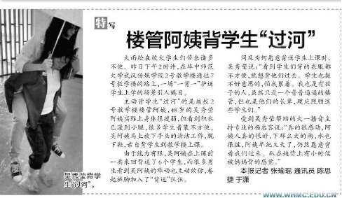 Ngày 29/5, trận mưa rào đã biến thành phố Vũ Hán thành thành phố biển, sân trường của Học viện Truyền thông Vũ Hán thuộc Đại học sư phạm Hoa Trung cũng ngập trong nước, các lối đi đã ngập úng, khi đó, một người phụ nữ trung niên đi dép lội nước cõng một nữ sinh tóc dài, tay cầm ô và sách lên lớp học.