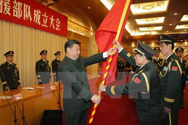 | Chủ tịch nước Trung Quốc Tập Cận Bình (trái) đã trao quân kỳ cho Bộ Tổng tư lệnh Lục quân Trung Quốc - Ảnh: TTXVN |
