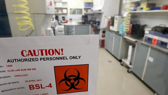 Tờ cảnh báo dán trên cửa Phòng thí nghiệm an toàn sinh học mức 4 tại Viện Nghiên cứu Dịch bệnh truyền nhiễm của Quân đội Mỹ tại Fort Detrick, Maryland. (Ảnh: AP)