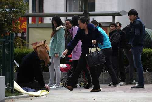 Hình ảnh cho thấy người đàn ông 38 tuổi đang quỳ bên vỉa hè, đeo mặt nạ đầu ngựa cạnh tấm biển có hình ảnh người con trai mắc bệnh nan và dòng chữ: 1 lần cưỡi 5 tệ (khoảng 18.000 VNĐ). Ai có lòng tốt xin hãy cưỡi tôi 1 lần.”