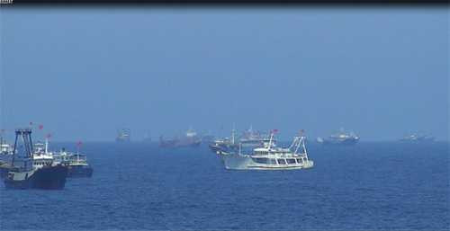 Trung Quốc bố trí số lượng tàu dày đặc trong đó có nhiều tàu cá vỏ sắt để bảo vệ giàn khoan và ngăn cản hoạt động thực thi pháp luật của các lực lượng chức năng Việt Nam. |