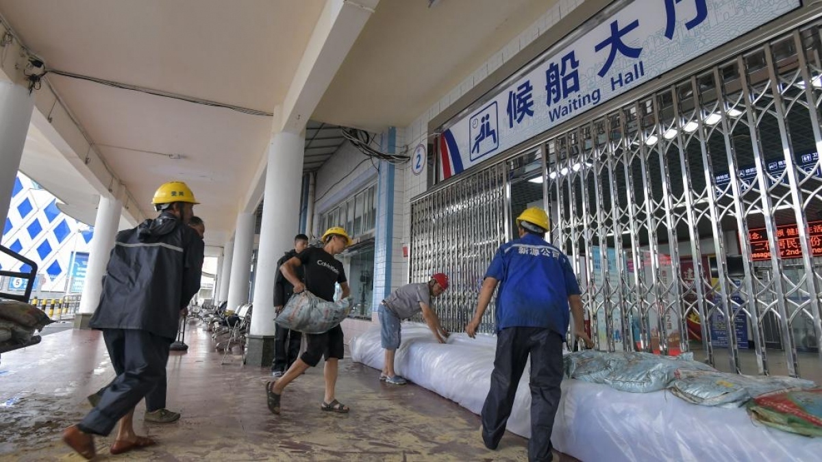 Ngày 16/7, công nhân đặt bao cát chặn lũ ở lối vào sảnh chờ của cảng Tú Anh ở thành phố Hải Khẩu, tỉnh Hải Nam. (Ảnh: VCG)