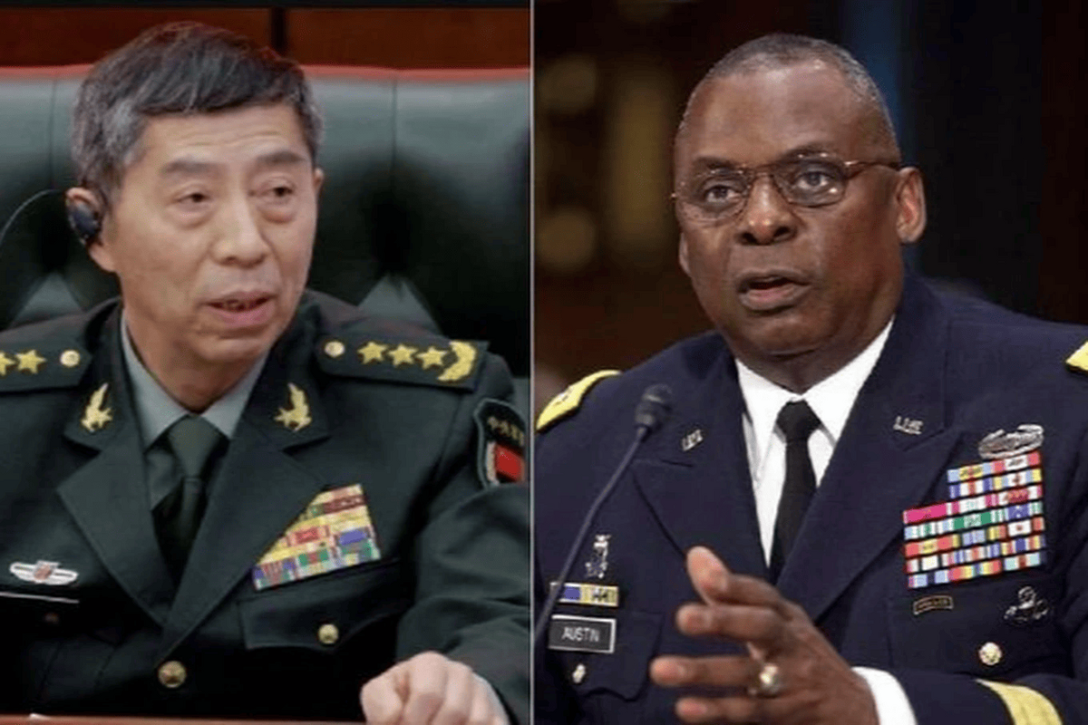 Bộ trưởng Quốc phòng Trung Quốc Lý Thượng Phúc và Bộ trưởng Quốc phòng Mỹ Lloyd Austin. (Ảnh: Getty)