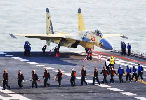 | Máy bay chiến đấu J-15 của Trung Quốc trên sàn tàu sân bay Liêu Ninh |