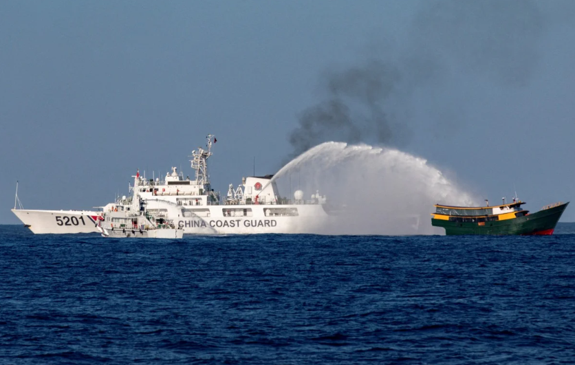 Cảnh quay trên không vào ngày 5/3/2024 cho thấy một tàu tuần duyên Trung Quốc bắn vòi rồng vào một tàu Philippines gần Bãi Cỏ Mây (thuộc Quần đảo Trường Sa của Việt Nam). (Ảnh: Lực lượng bảo vệ bờ biển Philippines)