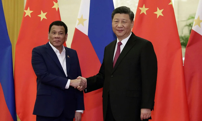 Chủ tịch Trung Quốc Tập Cận Bình (phải) và Tổng thống Philippines Rodrigo Duterte tại Đại lễ đường Nhân dân, Bắc Kinh tháng 4/2019. Ảnh: Reuters.