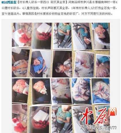 (VTC News) - Trưởng thôn Nam Thân, thị trấn Thủy Trại, huyện Y Xuyên, Lạc Dương, tỉnh Hà Nam (Trung Quốc) bị cho là đã đem người đến chém giết một nhà dân gồm 4 người, đồng thời buông lời phỉ báng, dọa đốt nhà họ.