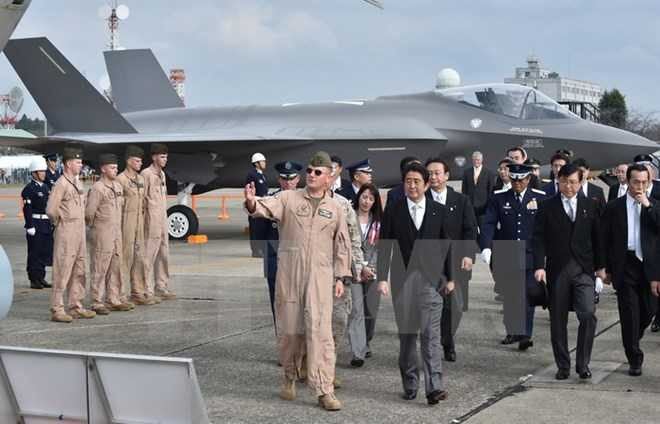 | Thủ tướng Nhật Bản Shinzo Abe (giữa-phải) thăm căn cứ không quân Hyakuri của Lực lượng phòng vệ Nhật Bản (Nguồn: AFP/TTXVN) |