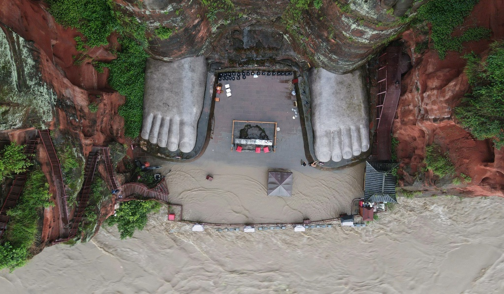 Lần đầu tiên kể từ năm 1949, mực nước sông Trường Giang ngập tới ngón chân của Lạc Sơn Đại Phật ở tỉnh Tứ Xuyên. Chính quyền tỉnh Tứ Xuyên đã nâng mức cảnh báo lũ lụt trên sông Trường Giang lên mức cao nhất, khi một đợt mưa lớn tiếp tục trút nước xuống khu vực này. (Ảnh: China News)